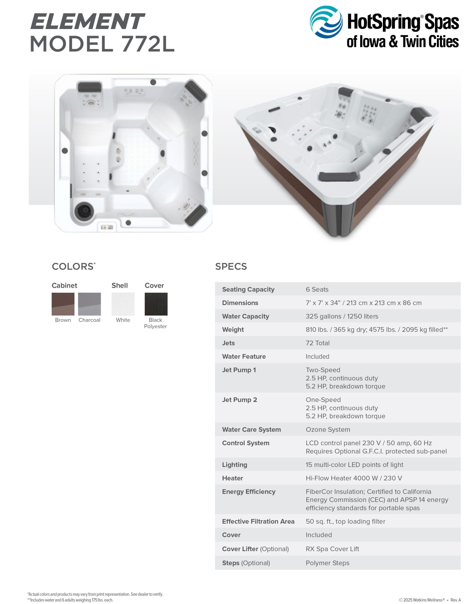 The Element stands out visually with sleek cabinet finishes in Brown or Charcoal and a white acrylic shell that fits beautifully into any backyard setting. Enjoy the calming built-in waterfall, 15-point multi-color LED lighting, and modern design details that create a serene spa experience day or night.